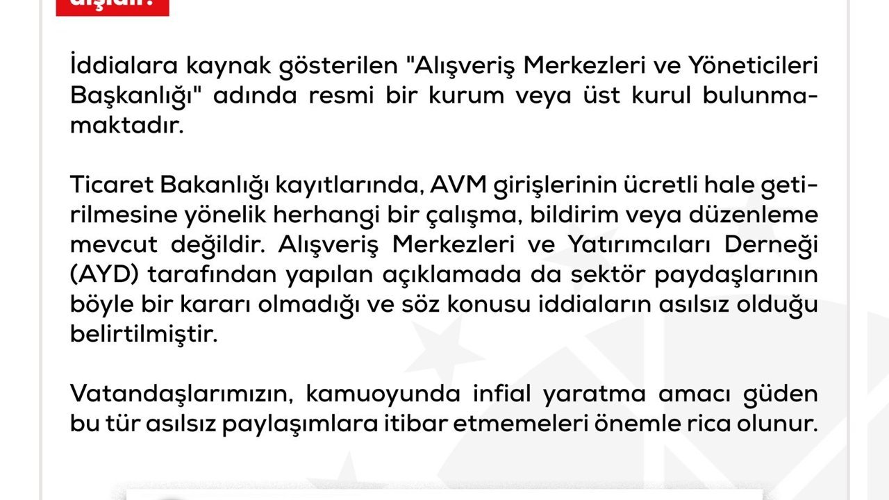 DMM'nin sanal medya hesabından yapılan açıklamada, 'Bazı sosyal medya hesaplarından paylaşılan 'Alışveriş Merkezleri ve Yöneticileri Başkanlığı'nın kararıyla AVM'lere girişlerin ücretli olacağı' yönündeki iddialar tamamen gerçek dışıdır. İddialara kaynak gösterilen 'Alışveriş Merkezleri ve Yöneticileri Başkanlığı' adında resmi bir kurum veya üst kurul bulunmamaktadır. Ticaret Bakanlığı kayıtlarında, AVM girişlerinin ücretli hale getirilmesine yönelik herhangi bir çalışma, bildirim veya düzenleme mevcut değildir. Alışveriş Merkezleri ve Yatırımcıları Derneği (AYD) tarafından yapılan açıklamada da sektör paydaşlarının böyle bir kararı olmadığı ve söz konusu iddiaların asılsız olduğu belirtilmiştir. Vatandaşlarımızın, kamuoyunda infial yaratma amacı güden bu tür asılsız paylaşımlara itibar etmemeleri önemle rica olunur' denildi. (DHA)