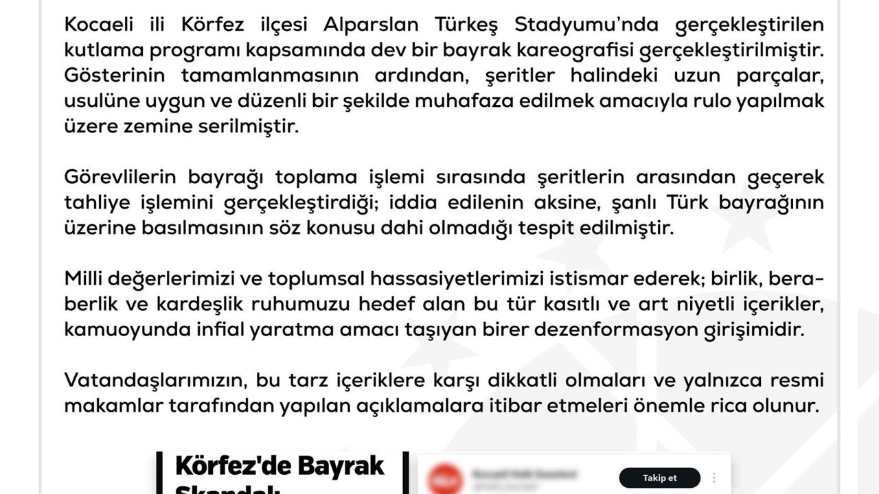 DMM'nin sanal medya hesabından yapılan açıklamada, '23 Nisan Ulusal Egemenlik ve Çocuk Bayramı kutlamaları üzerinden sosyal medyada paylaşılan Türk bayrağına saygısızlık yapıldığı yönündeki iddialar tamamen asılsızdır. Kocaeli ili Körfez ilçesi Alparslan Türkeş Stadyumu'nda gerçekleştirilen kutlama programı kapsamında dev bir bayrak kareografisi gerçekleştirilmiştir. Gösterinin tamamlanmasının ardından, şeritler halindeki uzun parçalar, usulüne uygun ve düzenli bir şekilde muhafaza edilmek amacıyla rulo yapılmak üzere zemine serilmiştir. Görevlilerin bayrağı toplama işlemi sırasında şeritlerin arasından geçerek tahliye işlemini gerçekleştirdiği; iddia edilenin aksine, şanlı Türk bayrağının üzerine basılmasının söz konusu dahi olmadığı tespit edilmiştir. Milli değerlerimizi ve toplumsal hassasiyetlerimizi istismar ederek; birlik, beraberlik ve kardeşlik ruhumuzu hedef alan bu tür kasıtlı ve art niyetli içerikler, kamuoyunda infial yaratma amacı taşıyan birer dezenformasyon girişimidir. Vatandaşlarımızın, bu tarz içeriklere karşı dikkatli olmaları ve yalnızca resmi makamlar tarafından yapılan açıklamalara itibar etmeleri önemle rica olunur' ifadelerine yer verildi. (DHA)