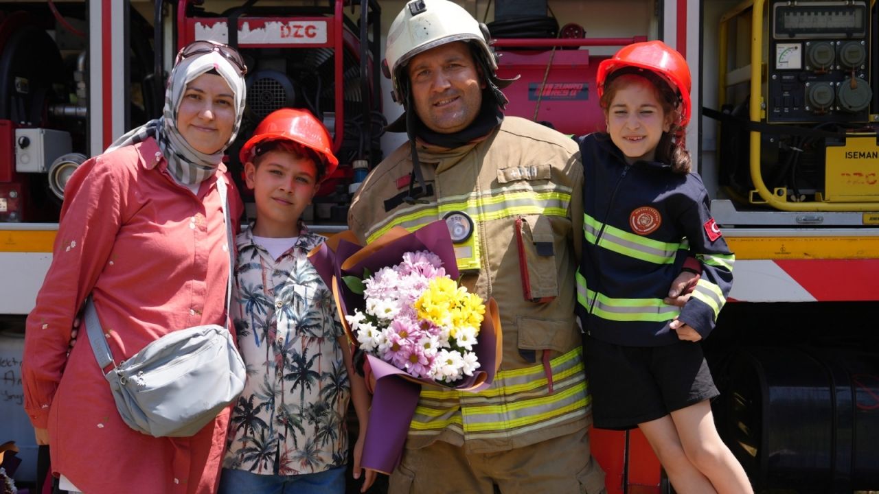Minik itfaiyeci kıyafetleri giyen çocuklar, ellerinde çiçeklerle babalarının yanına geldi. Babalar ve çocukların buluşması duygu dolu anlara sahne oldu.