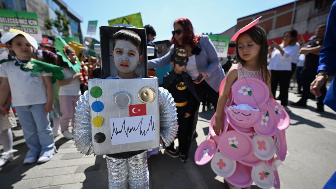 Belediye önünden başlayarak Millet Bahçesi'nde sona eren yürüyüşün ardından öğrenciler, atık malzemelerden yaptıkları kıyafetleri sergiledi.