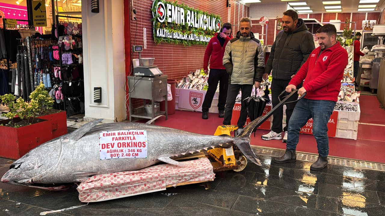Balıkçı tezgahında ilk defa bu büyüklükte bir balık gören vatandaşlar, anı ölümsüzleştirmek için fotoğraf çekindi. Tezgahta satışa sunulacak orkinosun kilosunun 800 TL olduğunu ifade eden balıkçı Emir Canikli, 'Uzun süredir böyle bir balık avlanmamıştı' diye konuştu.