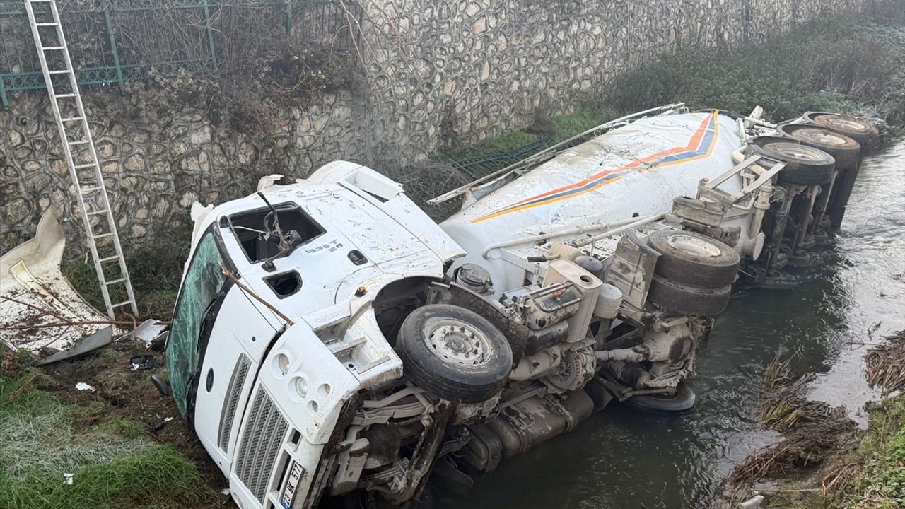 DÜZCE (AA) - Düzce'de dereye devrilen toz çimento yüklü silobasın sürücüsü yaralandı.