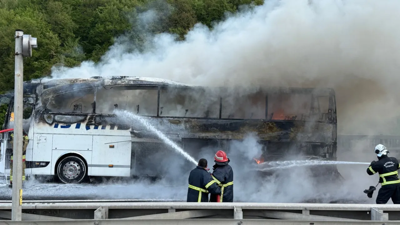 Hatay'dan İstanbul'a giden A.E.E'nin kullandığı 34 MTC 935 plakalı yolcu otobüsünün motor kısmı, Düzce Sarıçökek mevkisinde alev aldı.Sefer DEMİR / DÜZCE (İGFA) - Alınan bilgiye göre İstanbul'a seyir halinde olan yolcu otobüsü sürücüsü Düzce Sarıçökek mevkiinde durumu fark edince otobüsü sağ şeride çekerek yolcuları tahliye etti.