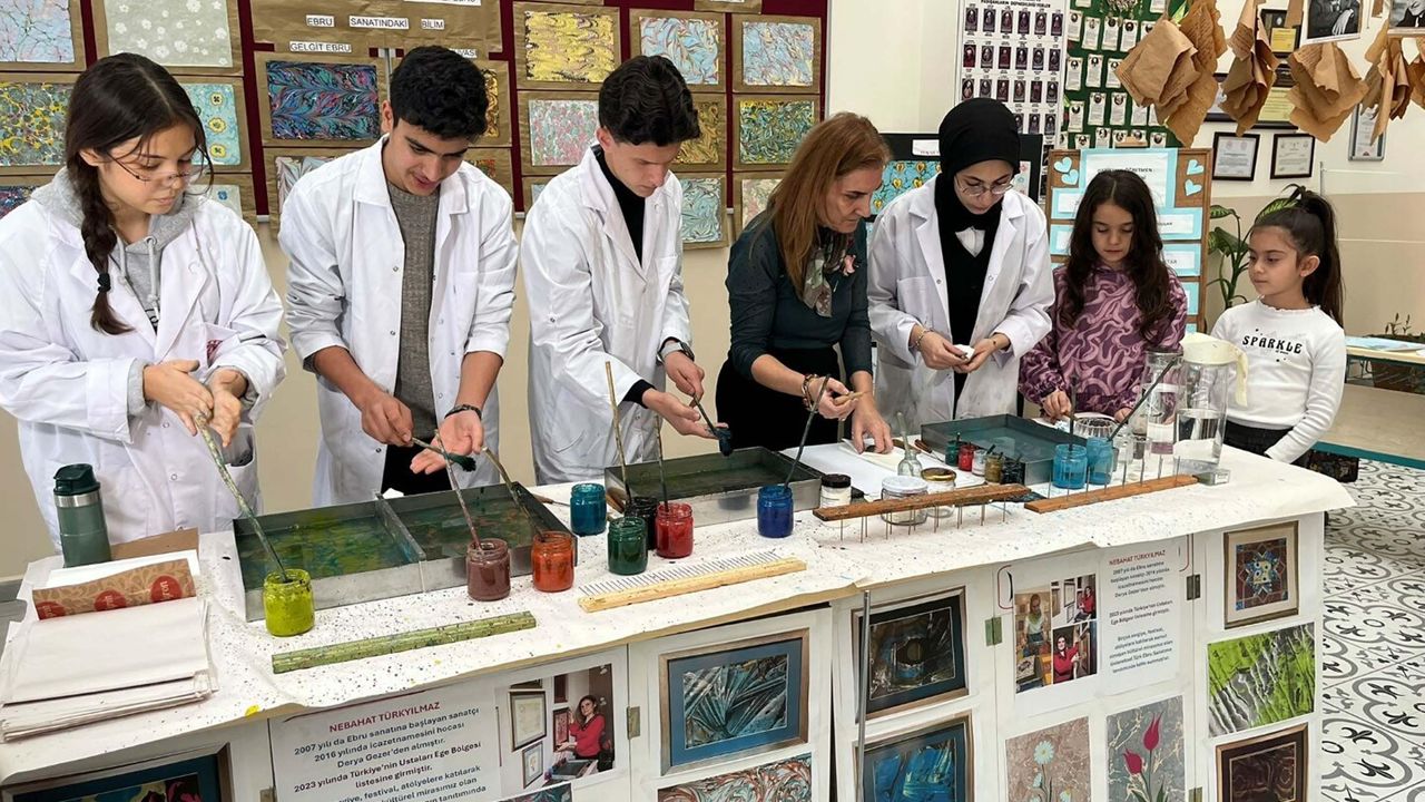 Ebru sanatçısı Nebahat Türkyılmaz da ebru sanatını tanıtmak için birçok davet aldığını belirtip, 'Bunlardan biri de öğrencilerimizi hem geleneksel sanat ile tanıtmak hem de sanatın içinde yer alan bilimi anlatmak adına buraya gelmek oldu. Öğrencilerin ebru sanatının içindeki fizik kurallarını deneyimleyerek öğrenmeleri, bilgilerini daha kalıcı hale getiriyor. Çocukların gözlerinde görmüş olduğum ışıltı ve sanata olan merak ve ilgilileri beni çok mutlu etti. Böylelikle aslında sanatın her yerde olduğunu bir kez daha görmüş oluyoruz' dedi.