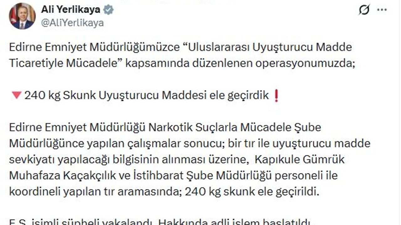 ANKARA, (DHA)- İÇİŞLERİ Bakanı Ali Yerlikaya, Edirne'de polisin, Kapıkule Gümrük Muhafaza Kaçakçılık ve İstihbarat Şube Müdürlüğü personeli ile birlikte bir TIR'da yaptığı aramada 240 kilogram skunk ele geçirildiğini açıkladı.