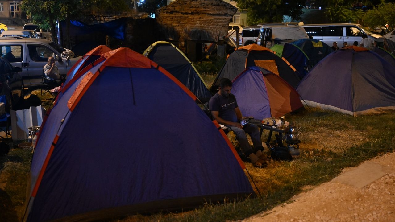 EDİRNE (AA) - Edirne'ye 664. Kırkpınar Yağlı Güreşleri'ni izlemeye gelen birçok kişi, otellerde yer bulamamaları nedeniyle Selimiye Camisi çevresinde kurdukları çadırlarda ya da kartonların üzerinde uyudu.