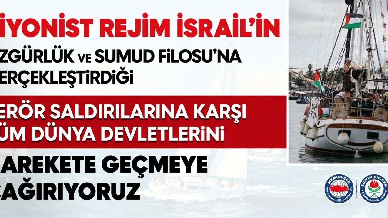 'Siyonist rejimin bu terör saldırısı, sadece Gazze'ye yönelik yardım çabalarını değil, aynı zamanda insanlığın ortak değerlerini hedef alan bir alçaklıktır. Cenevre Sözleşmeleri ve ek protokollerine göre, sivillere yönelik insani muameleye ilişkin yasal standartlar açıkça belirlenmiş ve çatışmalara aktif olarak katılmayanlar koruma altına alınmıştır. Bu kapsamda siviller ile insani yardım gönüllüleri özel korumadan yararlanır ve gözaltına alınamaz. Siviller, sağlık çalışanları ve yardım görevlileri gibi çatışmalara katılmayan kişilerden müteşekkil Özgürlük ve Sumud Filosu'nu hedef alan siyonist İsrail, Cenevre Sözleşmeleri'ni de ihlal etmiştir. Uluslararası hukuku ve bütün insani değerleri ayaklar altına almayı politika haline getirmiş siyonist rejimin bu terör saldırısı karşılıksız kalmamalıdır. Tüm devletler ortak hareket ederek, İsrail'i uluslararası toplumdan dışlamalı, bu yapının yöneticisi kılığında bulunan eşkıyalar, uluslararası hukuk karşısında yargılanmalıdır. Hukuk dışı müdahale ile alıkonulan Özgürlük ve Sumud Filosu'nda, aralarında Sendikamızın genel merkez ve şubelerinden 10 yöneticisinin de yer aldığı Türkiye Cumhuriyeti vatandaşı tüm aktivistlerin ülkemize sağ salim getirilmesi için devletimizin başlattığı girişimleri takip ediyor ve ivedilikle sonuçlanmasını bekliyoruz. Tüm dünya devletlerini, siyonist rejimin uluslararası sularda gerçekleştirdiği terör saldırısına karşı somut adımlar atmaya ve uluslararası hukuku korumaya çağırıyoruz.'