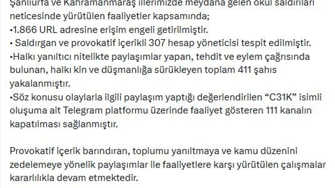 EGM'nin sanal medya hesabından yapılan açıklamada, 'Şanlıurfa ve Kahramanmaraş illerimizde meydana gelen okul saldırıları neticesinde yürütülen faaliyetler kapsamında; 1866 URL adresine erişim engeli getirilmiştir. Saldırgan ve provokatif içerikli 307 hesap yöneticisi tespit edilmiştir. Halkı yanıltıcı nitelikte paylaşımlar yapan, tehdit ve eylem çağrısında bulunan, halkı kin ve düşmanlığa sürükleyen toplam 411 şahıs yakalanmıştır. Söz konusu olaylarla ilgili paylaşım yaptığı değerlendirilen 'C31K' isimli oluşuma ait Telegram platformu üzerinde faaliyet gösteren 111 kanalın kapatılması sağlanmıştır. Provokatif içerik barındıran, toplumu yanıltmaya ve kamu düzenini zedelemeye yönelik paylaşımlar ile faaliyetlere karşı yürütülen çalışmalar kararlılıkla devam etmektedir' ifadelerine yer verildi. (DHA)