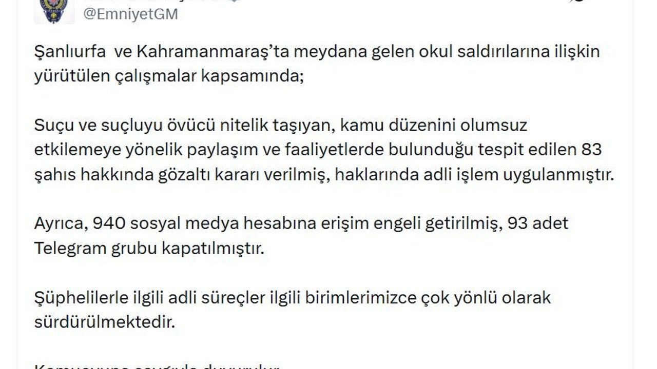 EGM'nin sanal medya hesabından yapılan açıklamada, 'Şanlıurfa ve Kahramanmaraş'ta meydana gelen okul saldırılarına ilişkin yürütülen çalışmalar kapsamında; suçu ve suçluyu övücü nitelik taşıyan, kamu düzenini olumsuz etkilemeye yönelik paylaşım ve faaliyetlerde bulunduğu tespit edilen 83 şahıs hakkında gözaltı kararı verilmiş, haklarında adli işlem uygulanmıştır. Ayrıca, 940 sosyal medya hesabına erişim engeli getirilmiş, 93 adet Telegram grubu kapatılmıştır. Şüphelilerle ilgili adli süreçler ilgili birimlerimizce çok yönlü olarak sürdürülmektedir' denildi. (DHA)