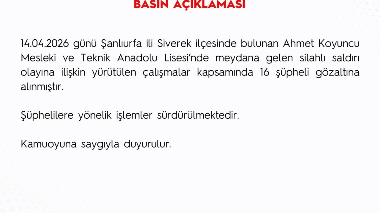 Emniyet Genel Müdürlüğü'nden (EGM) yapılan açıklamada, '14 Nisan günü Şanlıurfa ili Siverek ilçesinde bulunan Ahmet Koyuncu Mesleki ve Teknik Anadolu Lisesi'nde meydana gelen silahlı saldırı olayına ilişkin yürütülen çalışmalar kapsamında 16 şüpheli gözaltına alınmıştır. Şüphelilere yönelik işlemler sürdürülmektedir. Kamuoyuna saygıyla duyurulur' ifadeleri kullanıldı. (DHA)