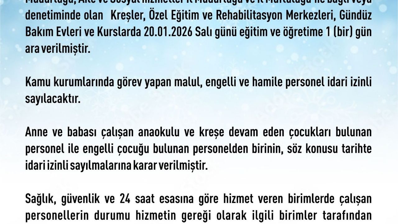 Valilik tarafından yapılan açıklamada, il merkezinde Milli Eğitim Müdürlüğü, Aile ve Sosyal Hizmetler İl Müdürlüğü ile İl Müftülüğüne bağlı veya denetiminde bulunan kreşler, özel eğitim ve rehabilitasyon merkezleri, gündüz bakım evleri ve kurslarda Salı günü eğitime ara verildiği belirtildi. Açıklamada, 'Yoğun kar yağışı ve buzlanma nedeniyle ilimiz merkezinde Milli Eğitim Müdürlüğü, Aile ve Sosyal hizmetler İl Müdürlüğü ve İl Müftülüğüne bağlı veya denetiminde olan Kreşler, Özel Eğitim ve Rehabilitasyon merkezleri, gündüz bakım evleri ve kurslara 20 Ocak Salı günü ara verilmiştir. Kamu kurumlarında görev yapan malul, engelli ve hamile personel idari izinli sayılacaktır. Anne ve babası çalışan anaokulu ve kreşe devam eden çocukları bulunan personel ile engelli çocuğu bulunan personelden birinin, söz konusu tarihte idari izinli sayılmalarına karar verilmiştir. Sağlık, güvenlik ve 24 saat esasına göre hizmet veren birimlerde çalışan personellerin durumu hizmetin gereği olarak ilgili birimler tarafından değerlendirilecektir. İlçelerimizde ilçe şartlarına göre Kaymakamlarca karar verilecektir' denildi. (DHA)