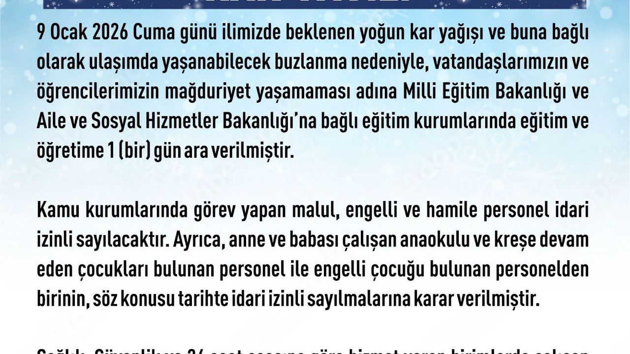 Elazığ Valiliği'nden yapılan açıklamada, kentte beklenen yoğun kar ve buzlanma nedeniyle eğitime 1 gün ara verildiği belirtildi. Valilik açıklamasında, '9 Ocak 2026 Cuma günü ilimizde beklenen yoğun kar yağışı ve buna bağlı olarak ulaşımda yaşanabilecek buzlanma nedeniyle, vatandaşlarımızın ve öğrencilerimizin mağduriyet yaşamaması adına Milli Eğitim Bakanlığı ve Aile ve Sosyal Hizmetler Bakanlığı'na bağlı eğitim kurumlarında eğitim ve öğretime 1 (bir) gün ara verilmiştir. Kamu kurumlarında görev yapan malul, engelli ve hamile personel idari izinli sayılacaktır. Ayrıca, anne ve babası çalışan anaokulu ve kreşe devam eden çocukları bulunan personel ile engelli çocuğu bulunan personelden birinin, söz konusu tarihte idari izinli sayılmalarına karar verilmiştir. Sağlık, Güvenlik ve 24 saat esasına göre hizmet veren birimlerde çalışan personellerin durumu hizmetin gereği olarak ilgili birimler tarafından değerlendirilecektir' denildi. (DHA)