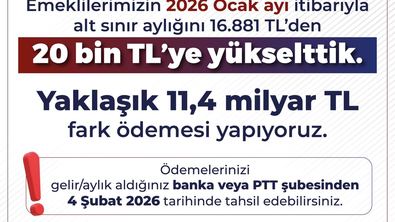 SGK'nın sanal medya hesabından yapılan açıklamada, 'Emeklilerimize ve hak sahiplerine fark tutarlarını ödüyoruz. Ödemelerinizi gelir/aylık aldığınız banka ve PTT şubesinden çekebilirsiniz. 4 Şubat 2026 tarihinde tahsil edebilirsiniz' denildi. Açıklamada ayrıca emeklilerin ocak itibarıyla alt sınır aylığının 16 bin 881 liradan 20 bin liraya yükseltildiği hatırlatılarak, bu kapsamda yaklaşık 11,4 milyar liralık fark ödemesi yapılacağı belirtildi. (DHA)