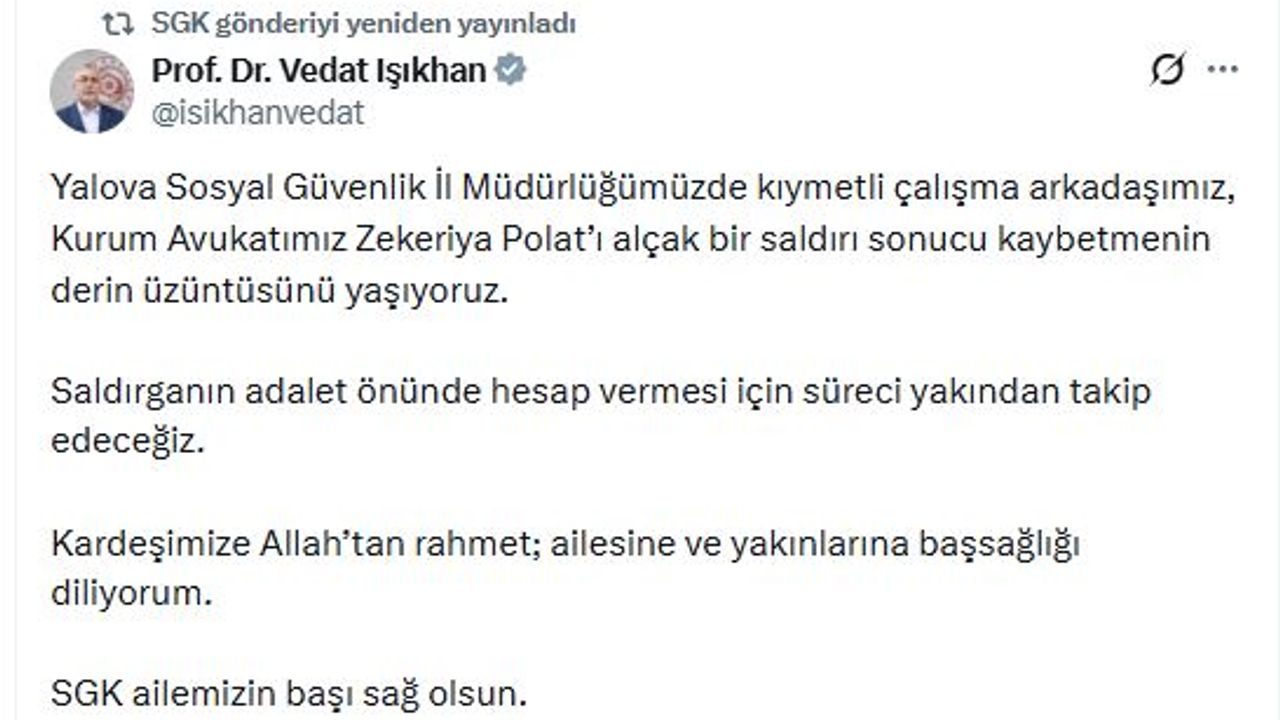 Çalışma ve Sosyal Güvenlik Bakanı Vedat Işıkhan, SGK Yalova İl Müdürlüğü'nde yaşanan saldırıya ilişkin sanal medya hesabından yaptığı açıklamada, 'Yalova Sosyal Güvenlik İl Müdürlüğümüzde kıymetli çalışma arkadaşımız, Kurum Avukatımız Zekeriya Polat'ı alçak bir saldırı sonucu kaybetmenin derin üzüntüsünü yaşıyoruz. Saldırganın adalet önünde hesap vermesi için süreci yakından takip edeceğiz. Kardeşimize Allah'tan rahmet; ailesine ve yakınlarına başsağlığı diliyorum. SGK ailemizin başı sağ olsun' dedi. (DHA)