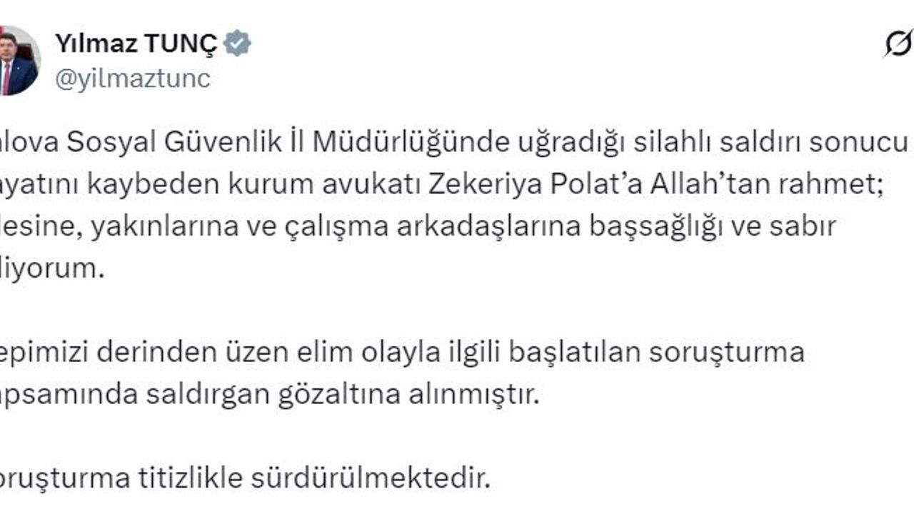 Adalet Bakanı Yılmaz Tunç, olaya ilişkin sanal medya hesabından açıklama yaptı. Bakan Tunç, 'Yalova Sosyal Güvenlik İl Müdürlüğünde uğradığı silahlı saldırı sonucu hayatını kaybeden kurum avukatı Zekeriya Polat'a Allah'tan rahmet; ailesine, yakınlarına ve çalışma arkadaşlarına başsağlığı ve sabır diliyorum. Hepimizi derinden üzen elim olayla ilgili başlatılan soruşturma kapsamında saldırgan gözaltına alınmıştır. Soruşturma titizlikle sürdürülmektedir' dedi. (DHA)
