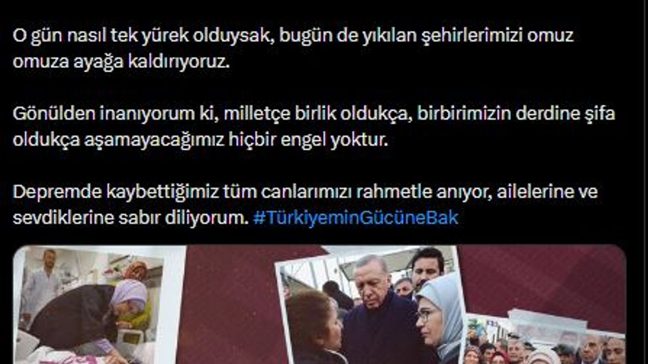 ANKARA, (DHA)- CUMHURBAŞKANI Recep Tayyip Erdoğan'ın eşi Emine Erdoğan, 6 Şubat 2023'te meydana gelen Kahramanmaraş merkezli depremlerde hayatını kaybedenleri andı.