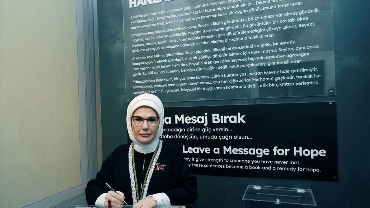Erdoğan, serginin enstalasyon alanlarından, 'Hanzala'dan Kalanlar' Umuda Mesaj Bırak alanında, 'Filistin bir gün yeniden barış yurdu olacak ve güvercinler bu müjdeyi tüm çocuklara taşıyacak. O güne kadar, siz her zaman dualarımızda, bizse hep sizin yanınızda olacağız.' mesajını deftere yazdı.
