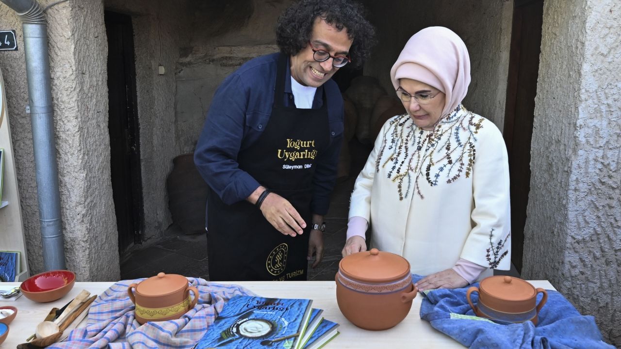 Burada yazar Süleyman Dilsiz ile Kapadokya'ya özgü çömleğe yoğurt mayalayan Emine Erdoğan, aynı yöntemle daha önce mayalanan yoğurdun da tadına baktı.