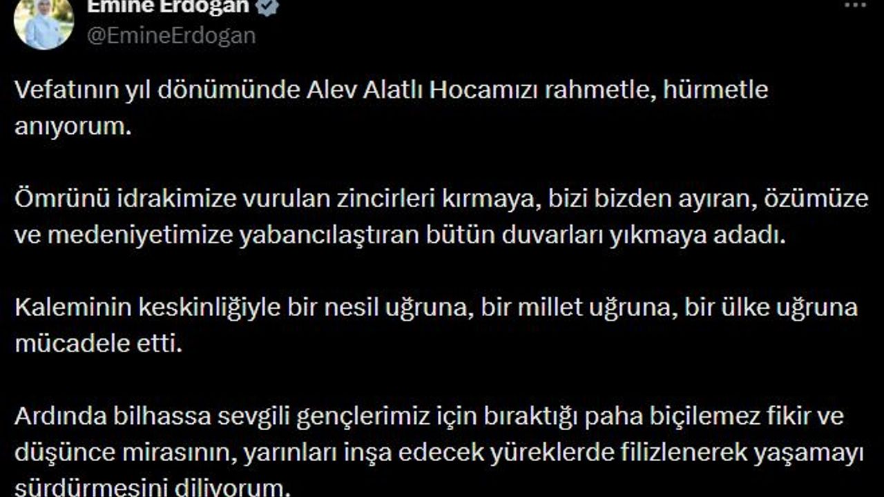 Emine Erdoğan, sanal medya hesabından yaptığı paylaşımda, 'Vefatının yıl dönümünde Alev Alatlı Hocamızı rahmetle, hürmetle anıyorum. Ömrünü idrakimize vurulan zincirleri kırmaya, bizi bizden ayıran, özümüze ve medeniyetimize yabancılaştıran bütün duvarları yıkmaya adadı. Kaleminin keskinliğiyle bir nesil uğruna, bir millet uğruna, bir ülke uğruna mücadele etti. Ardında bilhassa sevgili gençlerimiz için bıraktığı paha biçilemez fikir ve düşünce mirasının, yarınları inşa edecek yüreklerde filizlenerek yaşamayı sürdürmesini diliyorum' dedi. (DHA)