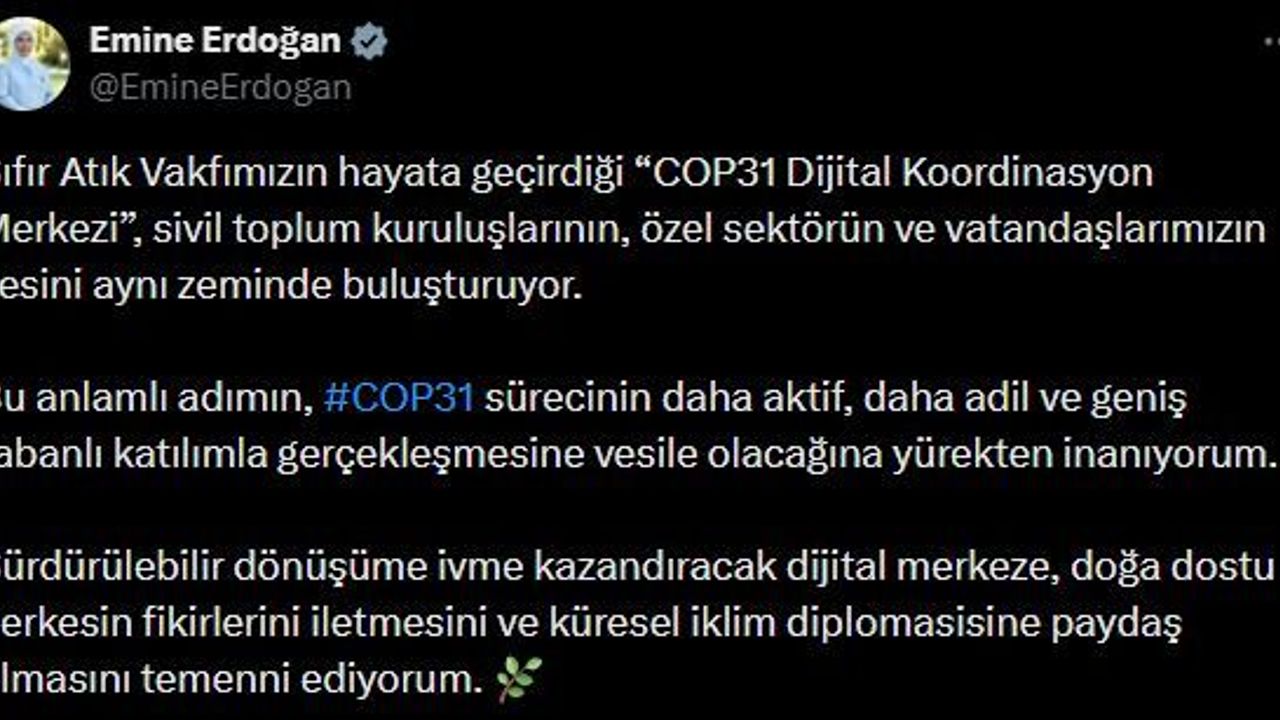 ANKARA, (DHA)- CUMHURBAŞKANI Recep Tayyip Erdoğan'ın eşi Emine Erdoğan, COP31 Dijital Koordinasyon Merkezi'nin faaliyete geçmesine ilişkin paylaşım yaptı.