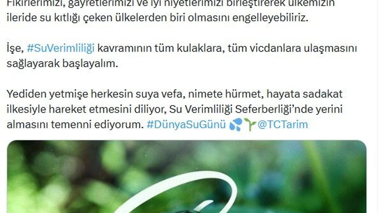 Emine Erdoğan, sanal medya hesabından paylaştığı mesajda, 'Bugün su, tüm ülkelerin bekasının, milli güvenliğinin ve gıda güvenliğinin konusudur. Halihazırda su stresi altında olan bir ülke olarak, tehlike kapımızı çalmadan harekete geçmeliyiz. Fikirlerimizi, gayretlerimizi ve iyi niyetlerimizi birleştirerek ülkemizin ileride su kıtlığı çeken ülkelerden biri olmasını engelleyebiliriz. İşe, su verimliliği kavramının tüm kulaklara, tüm vicdanlara ulaşmasını sağlayarak başlayalım. 7'den 70'e herkesin suya vefa, nimete hürmet, hayata sadakat ilkesiyle hareket etmesini diliyor, Su Verimliliği Seferberliği'nde yerini almasını temenni ediyorum' ifadelerini kullandı. (DHA)