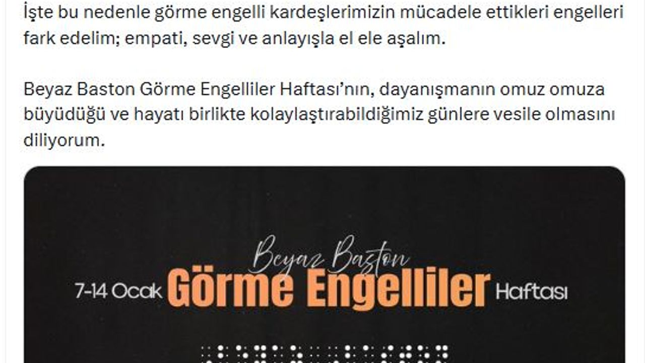 ANKARA, (DHA)- CUMHURBAŞKANI Recep Tayyip Erdoğan'ın eşi Emine Erdoğan, '7-14 Ocak Beyaz Baston Görme Engelliler Haftası'na ilişkin paylaşım yaptı.