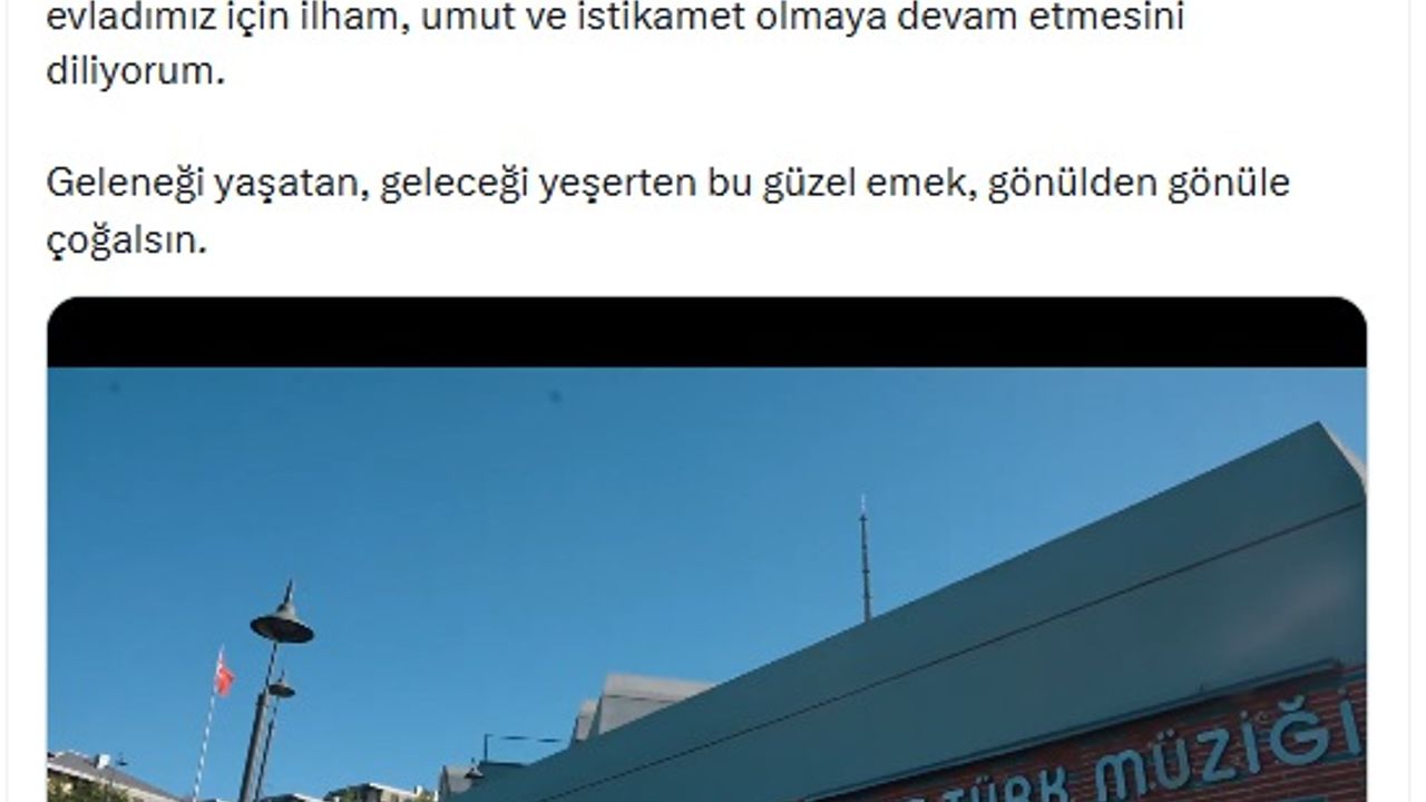 Emine Erdoğan, sanal medya hesabında, Palet Türk Müziği İlkokulu ziyaretinden görüntüler paylayarak, 'Türk Müziği'ne yürekten bağlı nice evladımız için ilham, umut ve istikamet olmaya devam etmesini diliyorum. Palet Türk Müziği İlkokulu'nun, Türk Müziği'ne yürekten bağlı nice evladımız için ilham, umut ve istikamet olmaya devam etmesini diliyorum. Geleneği yaşatan, geleceği yeşerten bu güzel emek, gönülden gönüle çoğalsın' ifadelerini kullandı. (DHA)