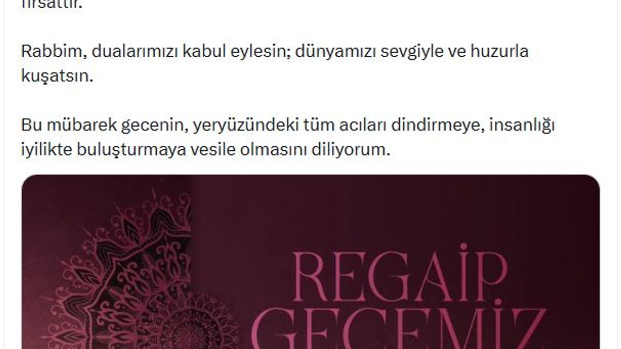 Emine Erdoğan, sosyal medya hesabından yaptığı paylaşımda, 'Milletimizin ve tüm İslam aleminin Regaip Gecesi ile mübarek üç aylarını tebrik ediyorum. Duaların kabul için göklere yükseldiği bu kutlu gece; kalplerimizi iyilikle doldurmak, insanlık adına merhamet ve kardeşlik dilemek için bir fırsattır. Rabbim, dualarımızı kabul eylesin; dünyamızı sevgiyle ve huzurla kuşatsın. Bu mübarek gecenin, yeryüzündeki tüm acıları dindirmeye, insanlığı iyilikte buluşturmaya vesile olmasını diliyorum' dedi. (DHA)