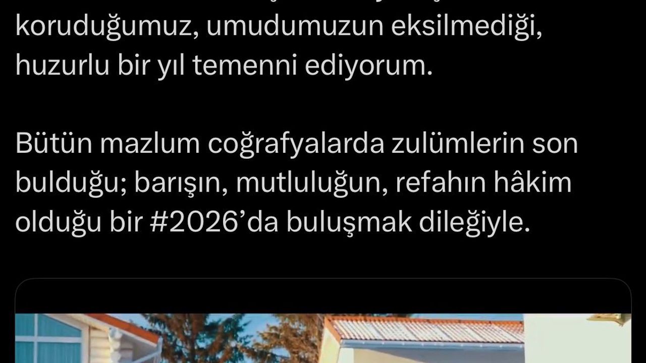 Emine Erdoğan, sanal medya hesabından paylaştığı mesajda, 'Yeni yılın ülkemiz, milletimiz ve tüm insanlık için hayırlara vesile olmasını diliyorum. Birlik ve beraberlik içinde dayanışmamızı koruduğumuz, umudumuzun eksilmediği, huzurlu bir yıl temenni ediyorum. Bütün mazlum coğrafyalarda zulümlerin son bulduğu; barışın, mutluluğun, refahın hakim olduğu bir 2026'da buluşmak dileğiyle' ifadelerini kullandı. (DHA)