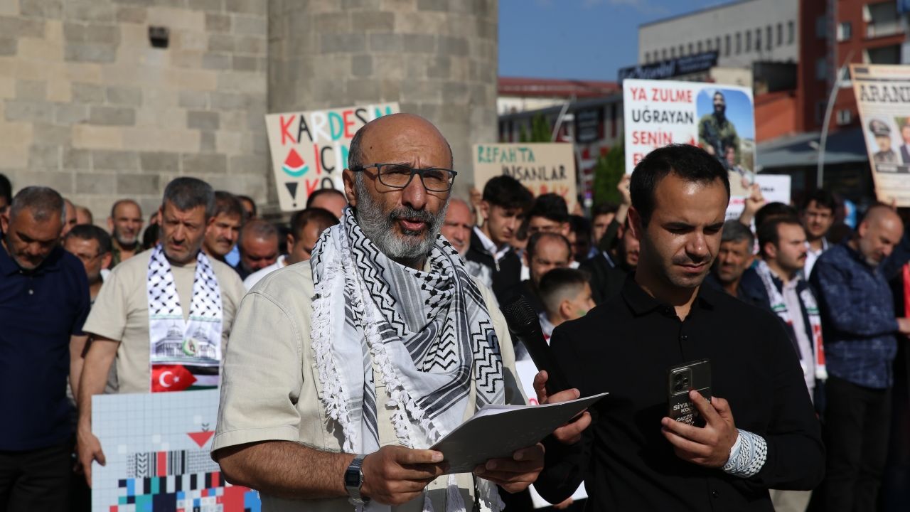 Kent merkezindeki Lala Paşa Cami önünde bir araya gelen vatandaşlar, Türk, Filistin ve Doğu Türkistan bayrakları eşliğinde, taşıdıkları döviz ve pankartlarla Yakutiye Medresesi'ne yürüdü.