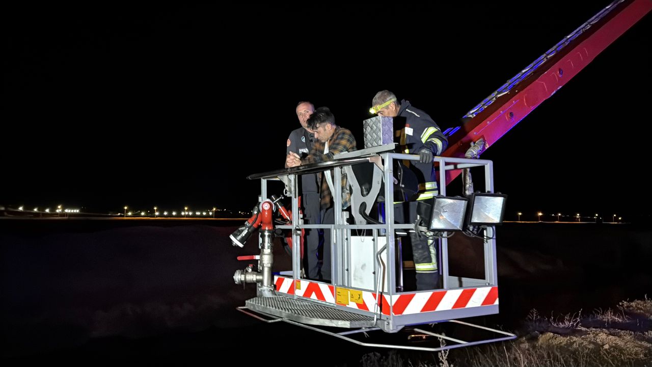 Kendi imkanlarıyla çıktığı aracın tavanında beklemeye başlayan Yunus K, itfaiyeye ait vinçle bulunduğu yerden alındı.