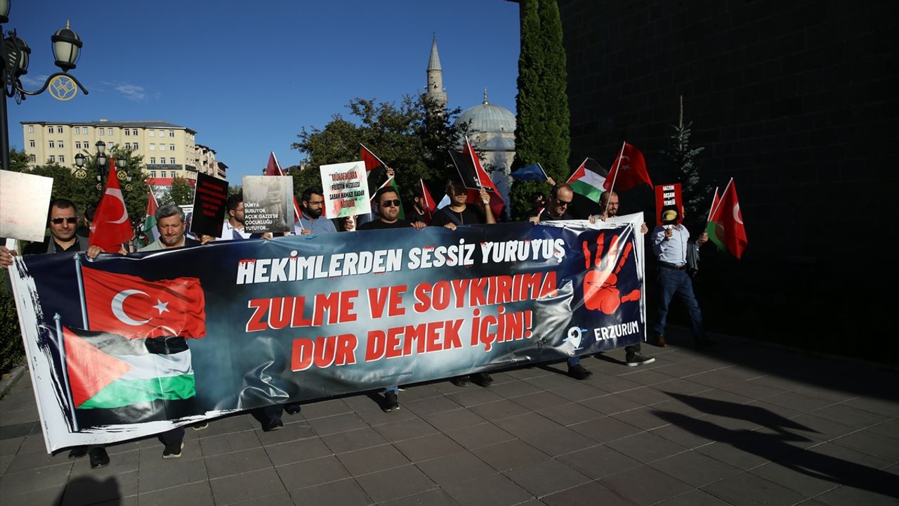 Kent merkezindeki Lala Paşa Camisi önünde bir araya gelen sağlık çalışanları ve vatandaşlar, Türk ve Filistin bayrakları eşliğinde taşıdıkları döviz ve pankartlarla Yakutiye Medresesi'ne yürüdü.