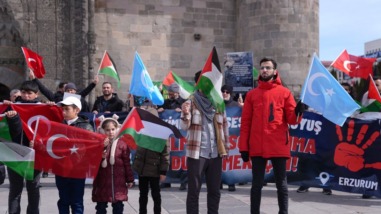 Kent merkezindeki Lalapaşa Camisi'nin önünde bir araya gelen doktorlar, tıp fakültesi öğrencileri ile sağlık çalışanları, Türk, Filistin ve Doğu Türkistan bayrakları eşliğinde döviz ve pankartlarla Yakutiye Medresesi'ne kadar yürüdü.