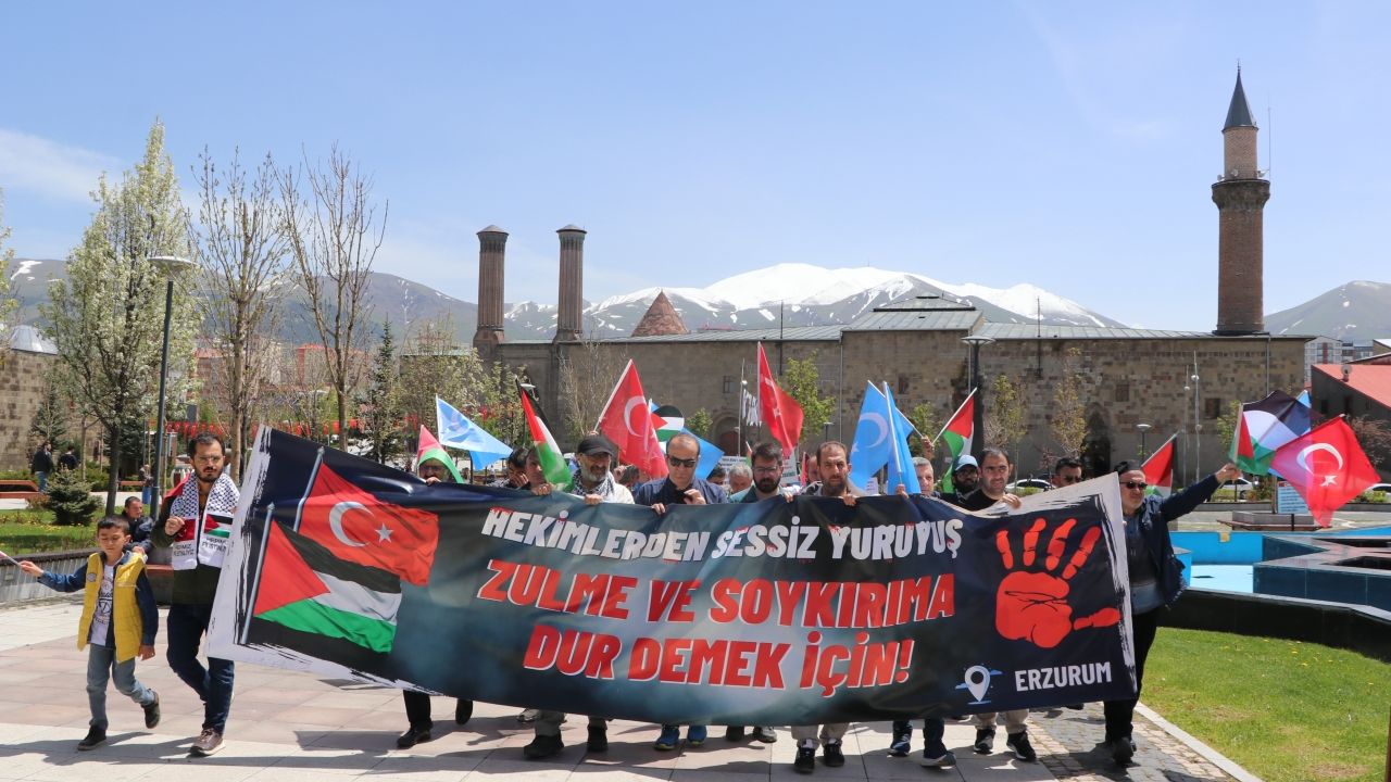 Kent merkezindeki Erzurum Kalesi önünde bir araya gelen aralarında doktor ve tıp fakültesi öğrencilerinin de bulunduğu sağlıkçılar, Türk, Filistin ve Doğu Türkistan bayrakları eşliğinde, taşıdıkları döviz ve pankartlarla kalenin içinde yürüdü.