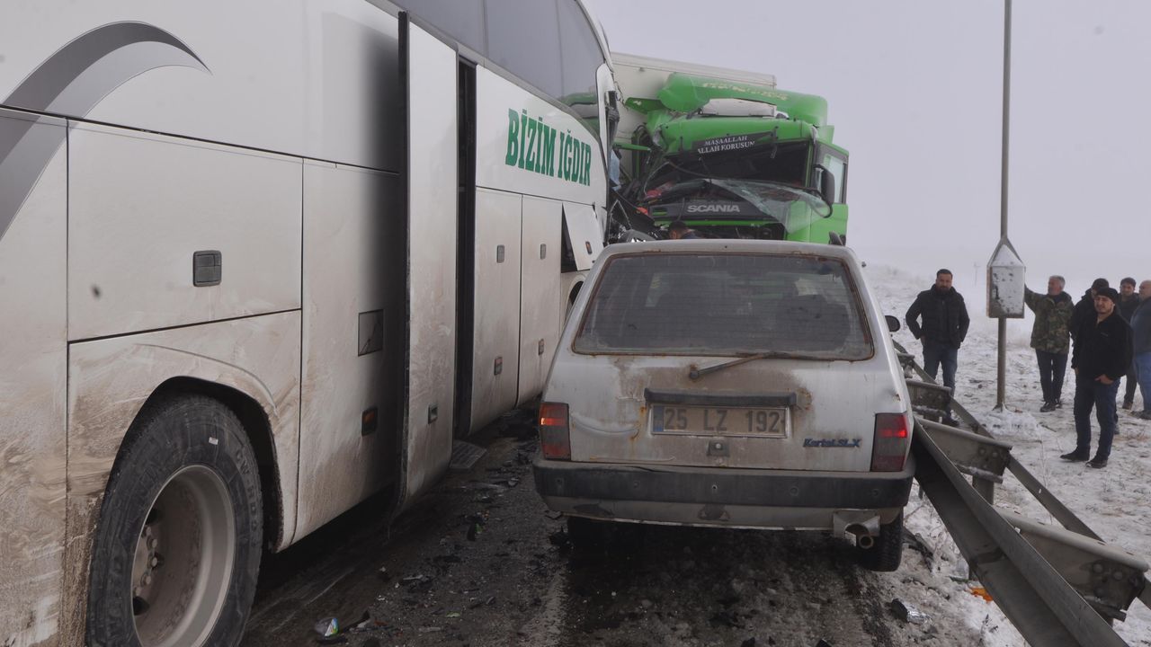 Kaza, sabah saatlerinde, Erzurum-Erzincan kara yolu Kandilli yol ayrımı yakınlarında meydana geldi. Yoğun sis ve kar yağışı sebebiyle kayganlaşan yolda Erzurum istikametine giden 73 DV 258 plakalı TIR, kaydı. Sürücüsünün direksiyon hakimiyetini kaybettiği TIR'ın kafa kısmı ters döndü. Bu sırada aynı istikamette ilerleyen 34 DGD 651 plakalı yolcu otobüsü duramayıp, ters dönen TIR'ın kafa bölümüne çarptı. Yolda ilerleyen 11 araç da kazaya karıştı. İhbar üzerine bölgeye jandarma, AFAD, itfaiye, sağlık ekipleri sevk edildi. Sağlık görevlileri araçlardan çıkarılan yaralılara ilk müdahalelerini yapıp, ambulanslarla Erzurum'daki hastanelere sevk etti.