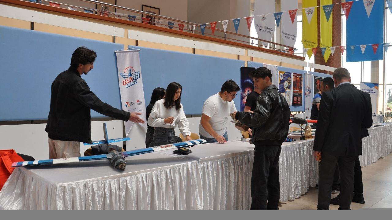 Üniversitenin Öğrenci Merkezi Fuaye Alanı ile Yunus Emre Konferans Salonu'nda gerçekleştirilen etkinlikte, 1-4 Mayıs'ta KKTC'de düzenlenen dünyanın en büyük havacılık, uzay ve teknoloji festivali TEKNOFEST'e kabul edilen insansız hava aracı, roket, elektrikli araç ve robot projeleri sergilendi.
