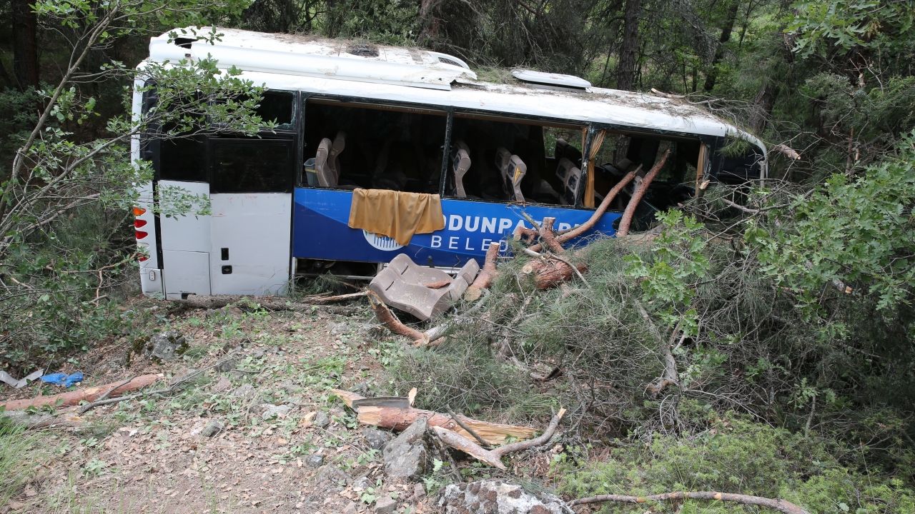 Yoldan çıkan midibüs, yaklaşık 10 metre ilerideki ağaçlara çarparak durabildi.