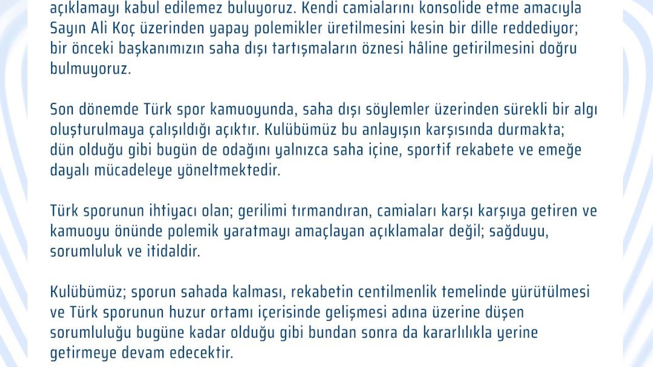 Sarı-lacivertli kulüp tarafından yapılan açıklamada söz konusu ifadelerin kabul edilemez olduğu vurgulanarak, 'Galatasaray Spor Kulübü'nün, bir önceki başkanımız Sayın Ali Koç hakkında yaptığı açıklamayı kabul edilemez buluyoruz. Kendi camialarını konsolide etme amacıyla Sayın Ali Koç üzerinden yapay polemikler üretilmesini kesin bir dille reddediyor; bir önceki başkanımızın saha dışı tartışmaların öznesi haline getirilmesini doğru bulmuyoruz. Son dönemde Türk spor kamuoyunda, saha dışı söylemler üzerinden sürekli bir algı oluşturulmaya çalışıldığı açıktır. Kulübümüz bu anlayışın karşısında durmakta; dün olduğu gibi bugün de odağını yalnızca saha içine, sportif rekabete ve emeğe dayalı mücadeleye yöneltmektedir. Türk sporunun ihtiyacı olan; gerilimi tırmandıran, camiaları karşı karşıya getiren ve kamuoyu önünde polemik yaratmayı amaçlayan açıklamalar değil; sağduyu, sorumluluk ve itidaldir. Kulübümüz; sporun sahada kalması, rekabetin centilmenlik temelinde yürütülmesi ve Türk sporunun huzur ortamı içerisinde gelişmesi adına üzerine düşen sorumluluğu bugüne kadar olduğu gibi bundan sonra da kararlılıkla yerine getirmeye devam edecektir' ifadelerine yer verildi.