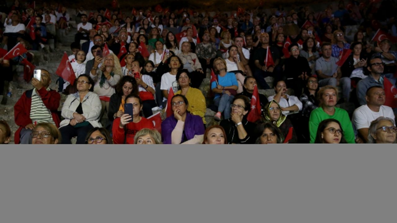 Vatandaşlar, tarihi tiyatroda orkestranın performansına ellerindeki Türk bayraklarıyla eşlik etti.