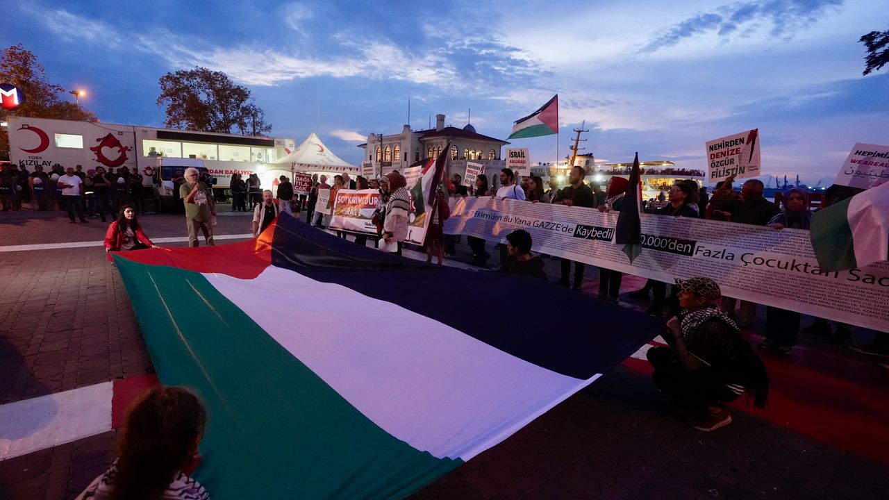 Katılımcılar, daha sonra ellerindeki Türk ve Filistin bayraklarıyla İskele Meydanı'na yürüdü.