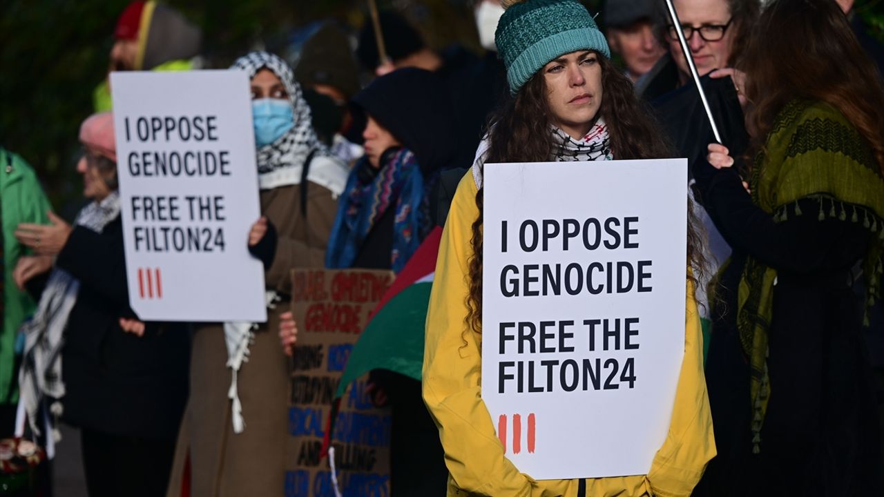 İsrailli savunma sanayii şirketi Elbit Systems'ın Bristol'deki tesisinde gerçekleştirilen eylem nedeniyle 'Filton 24' olarak anılan grubun yargı süreci devam ederken, göstericiler Londra'daki Woolwich Crown Court önünde, tutuklu sanıklara destek çağrısında bulundu.