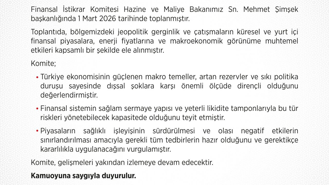 Hazine ve Maliye Bakanı Mehmet Şimşek başkanlığında toplanan toplantıya ilişkin yapılan açıklamada, toplantıda, bölgedeki jeopolitik gerilim ve çatışmaların küresel ve yurt içi finansal piyasalara, enerji fiyatlarına ve makroekonomik görünüme muhtemel etkilerinin kapsamlı bir şekilde ele alındığı belirtildi. Açıklamada, 'Komite, Türkiye ekonomisinin güçlenen makro temelleri, artan rezervler ve sıkı politika duruşu sayesinde dışsal şoklara karşı önemli ölçüde dirençli olduğunu değerlendirmiştir. Finansal sistemin sağlam sermaye yapısı ve yeterli likidite tamponlarıyla bu tür riskleri yönetebilecek kapasitede olduğunu teyit etmiştir. Piyasaların sağlıklı işleyişinin sürdürülmesi ve olası negatif etkilerin sınırlandırılması amacıyla gerekli tüm tedbirlerin hazır olduğunu ve gerektiğinde kararlılıkla uygulanacağını vurgulamıştır. Komite, gelişmeleri yakından izlemeye devam edecektir' ifadelerine yer verildi. (DHA)
