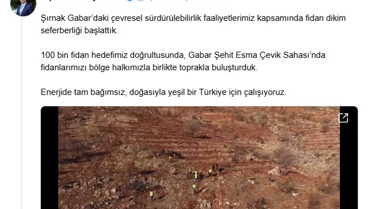 Konuya ilişkin NSosyal hesabından açıklama yapan Enerji ve Tabii Kaynaklar Bakanı Alparslan Bayraktar, 'Şırnak Gabar'daki çevresel sürdürülebilirlik faaliyetlerimiz kapsamında fidan dikim seferberliği başlattık. 100 bin fidan hedefimiz doğrultusunda, Gabar Şehit Esma Çevik Sahası'nda fidanlarımızı bölge halkımızla birlikte toprakla buluşturduk. Enerjide tam bağımsız, doğasıyla yeşil bir Türkiye için çalışıyoruz' dedi. (DHA)