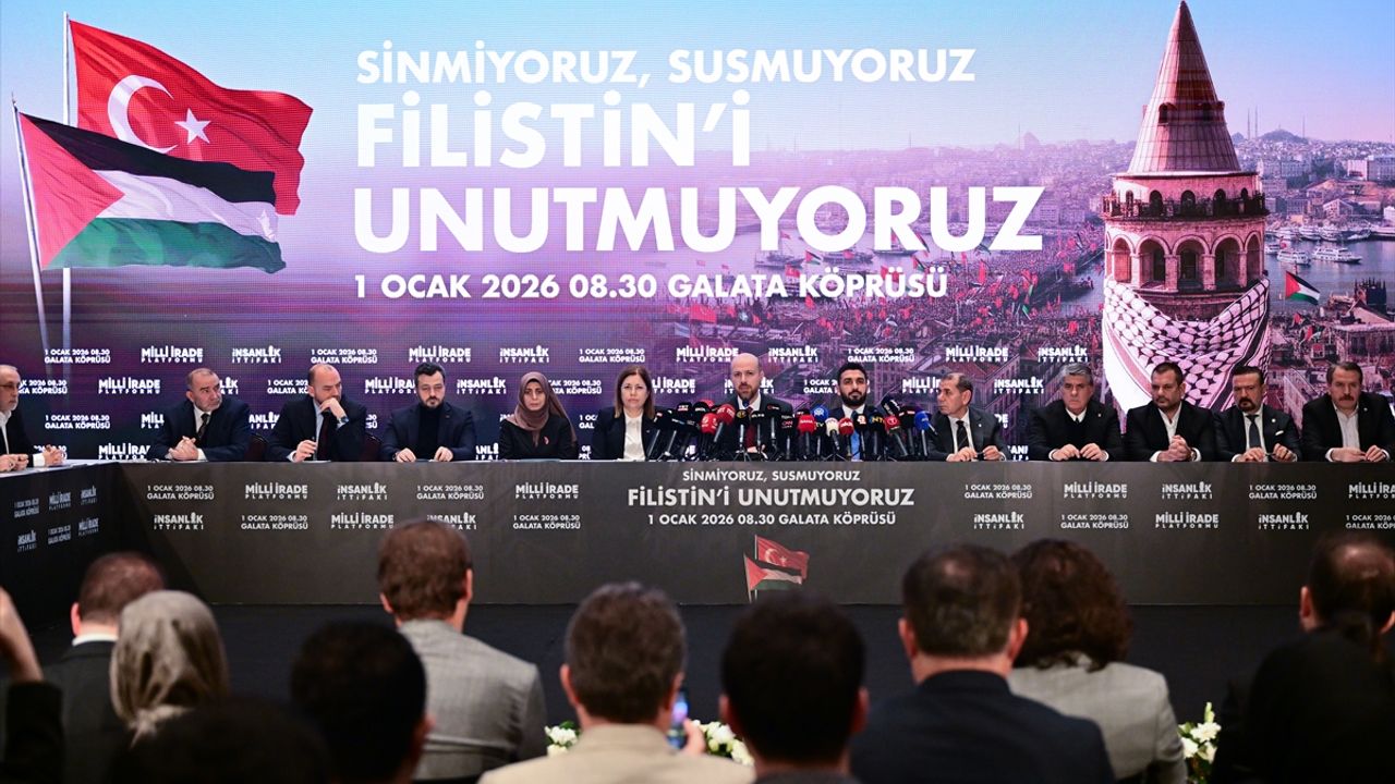 '1 Ocak 2026 sabahı, saat 08.30'da 'Unutmayız' demekle yetinmediğimizi, unutmadığımızı ve unutturmayacağımızı göstermek için Galata Köprüsü'ne gelin. Anneler, babalar, gençler suskunluğun duvarını yıkmaya, alışkanlığın zincirini kırmaya, vicdanın, merhametin temsilcisi olmaya gelin. Vakıflar, dernekler, cemiyetler, camialar, kınama cümlelerinin ötesine geçin. Sahaya, sokağa, şahitliğe gelin. Basın mensupları, fenomenler, sanatçılar, bir manşet değil bir hakikat taşıyın, mazlumun sesini satır satır dünyaya duyurmaya, tarihe vicdan kaydı düşmeye gelin. O, bu, şu demeden hep beraber gelin. Bütün kimliklerden arınarak gelin. Gelin ki yeni yılın ilk mesajını tüm dünyaya hep beraber verelim. Sinmediğimizi, susmadığımızı, Filistin'i, unutmadığımızı tüm dünyaya hep beraber gösterelim.'