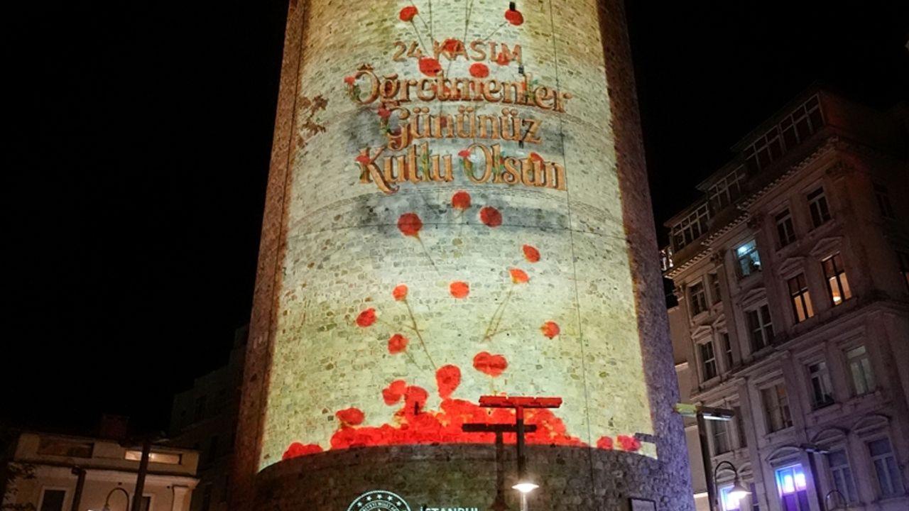 İstanbul İl Milli Eğitim Müdürlüğü tarafından düzenlenen mapping gösteriminde, '24 Kasım Öğretmenler Gününüz Kutlu Olsun' yazısı kuleye yansıtıldı.