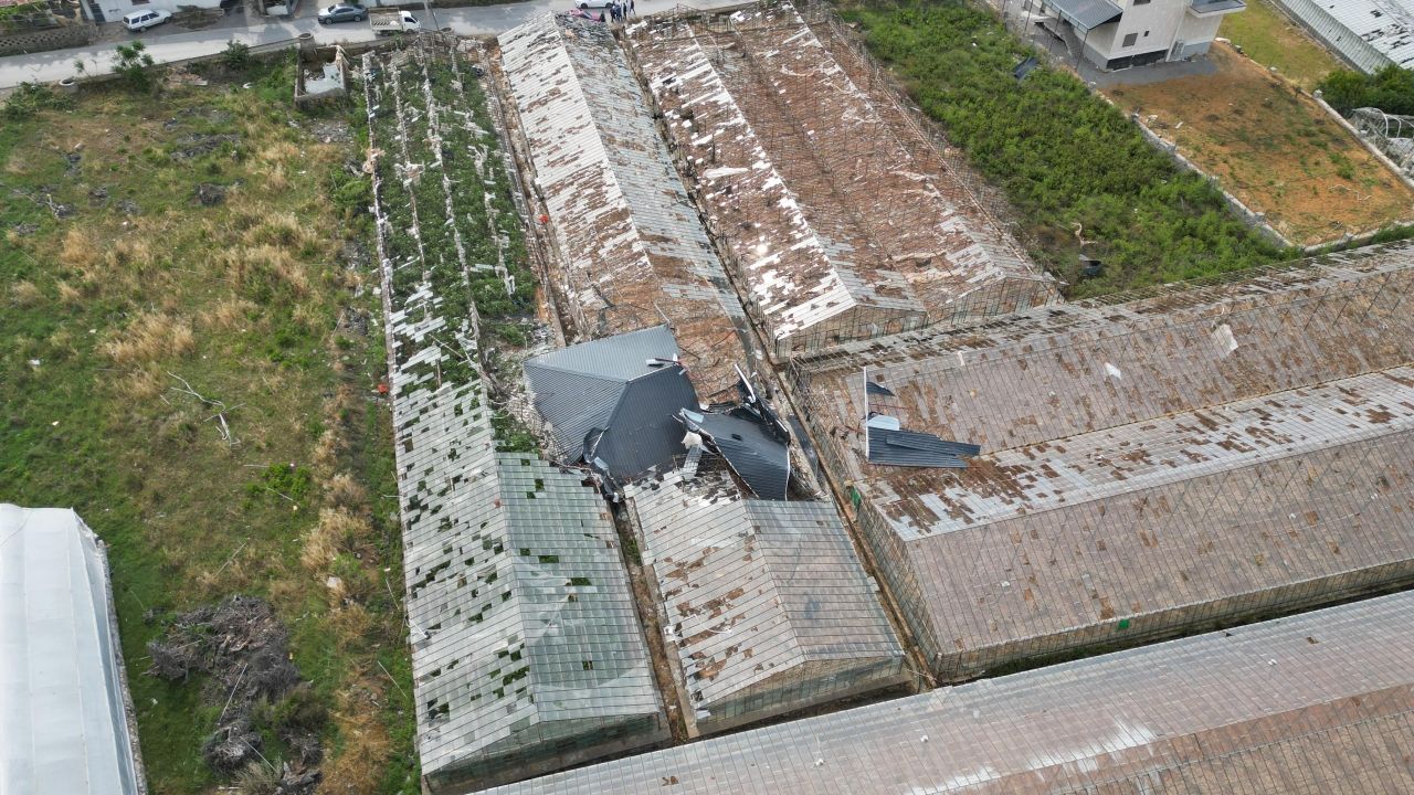 Dün, Beyobası Mahallesi'nde oluşan hortum nedeniyle seraların camları kırıldı, naylon ve demirleri zarar gördü.