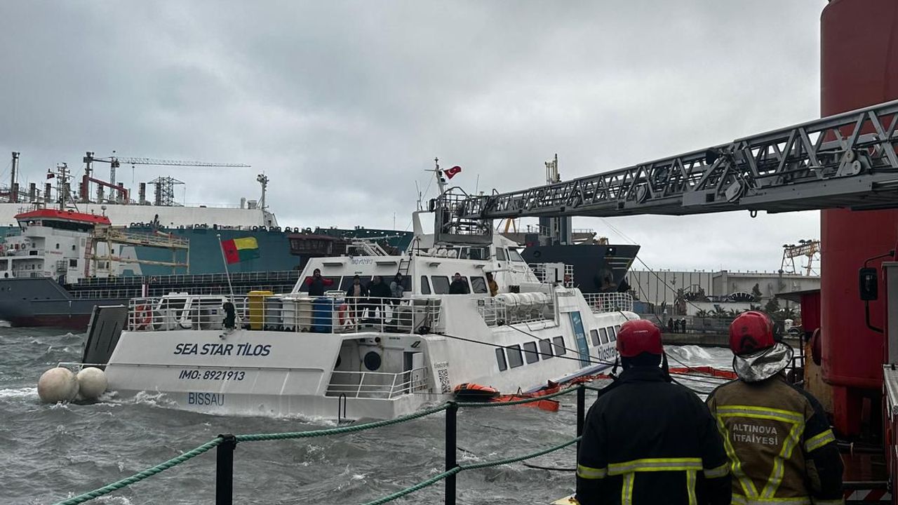 Altınova Tersaneler Bölgesi'nde yabancı bayraklı 'Sea Star Tilos' adlı yolcu gemisi, bağlı bulunduğu tersanede bakım ve onarımı yapılırken, fırtına nedeniyle 6 personel iskeleye inemeyip mahsur kaldı. İhbarla bölgeye itfaiye ekipleri sevk edildi. 6 personel mahsur kaldıkları gemiden Altınova Belediyesi İtfaiye ekipleri tarafından, sepetli itfaiye merdiveniyle tahliye edildi. O anlar, cep telefonu kamerasıyla görüntülendi. (DHA)