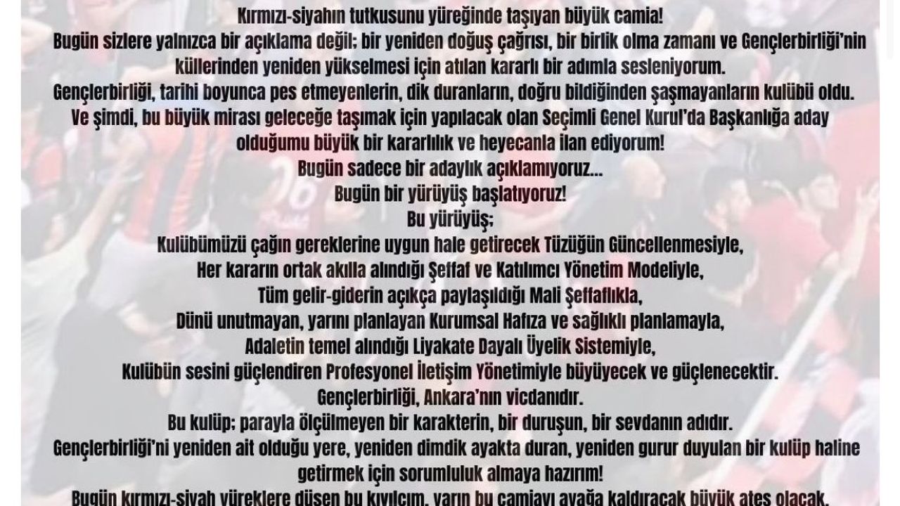 'Kırmızı-siyahın tutkusunu yüreğinde taşıyan büyük camia! Bugün sizlere yalnızca bir açıklama değil; bir yeniden doğuş çağrısı, bir birlik olma zamanı ve Gençlerbirliği'nin küllerinden yeniden yükselmesi için atılan kararlı bir adımla sesleniyorum. Gençlerbirliği, tarihi boyunca pes etmeyenlerin, dik duranların, doğru bildiğinden şaşmayanların kulübü oldu. Ve şimdi, bu büyük mirası geleceğe taşımak için yapılacak olan Seçimli Genel Kurul'da Başkanlığa aday olduğumu büyük bir kararlılık ve heyecanla ilan ediyorum! Bugün sadece bir adaylık açıklamıyoruz. Bugün bir yürüyüş başlatıyoruz! Bu yürüyüş; 'Kulübümüzü çağın gereklerine uygun hale getirecek Tüzüğün Güncellenmesiyle, Her kararın ortak akılla alındığı Şeffaf ve Katılımcı Yönetim Modeliyle, Tüm gelir-giderin açıkça paylaşıldığı Mali Şeffaflıkla, Dünü unutmayan, yarını planlayan Kurumsal Hafıza ve sağlıklı planlamayla, Adaletin temel alındığı Liyakate Dayalı Üyelik Sistemiyle, Kulübün sesini güçlendiren Profesyonel İletişim Yönetimiyle büyüyecek ve güçlenecektir.' Gençlerbirliği, Ankara'nın vicdanıdır. Bu kulüp: parayla ölçülmeyen bir karakterin, bir duruşun, bir sevdanın adıdır. Gençlerbirliği'ni yeniden ait olduğu yere, yeniden dimdik ayakta duran, yeniden gurur duyulan bir kulüp haline getirmek için sorumluluk almaya hazırım! Bugün kırmızı-siyah yüreklere düşen bu kıvılcım, yarın bu camiayı ayağa kaldıracak büyük ateş olacak. Birlik olursak yapamayacağımız hiçbir şey yok! Haydi Gençlerbirliği ailesi, Güçlenme zamanı! Ayağa kalkma zamanı! Birlikte yeniden doğma zamanı! Saygı, sevgi ve büyük bir heyecanla... Çağrı ÇetinGençlerbirliği Başkan Adayı' (DHA)