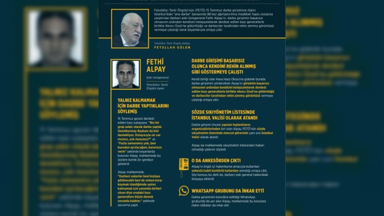 Darbeci general Alpay, FETÖ'nün sözde sıkıyönetim listesinde mevcut görevinin yanı sıra sözde "İstanbul Valisi" olarak atandı. Darbe girişiminin koordine edildiği WhatsApp grubunda da yer alan Alpay, mahkemede bu konulara ilişkin iddiaları da inkar etti.