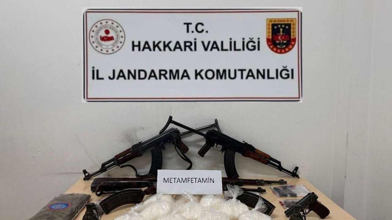 Hakkari İl Jandarma Komutanlığı Narkotik Suçlarla Mücadele Şubesi ekipleri, Çukurca ilçesinde C.G. ve G.G.'nin adreslerinde uyuşturucu ve silah olduğu ihbarı aldı. İhbarla her iki adrese operasyon düzenlendi. Operasyonda adreslerde yapılan aramada 5 kilo metamfetamin ile 3 AK-47 Kalaşnikof piyade tüfeği, 1 mavzer tüfek, 2 el bombası, 1 tabanca, 19 şarjör, 424 fişek, 2 kütüklük ve 34 doldurma aparatı ele geçirildi. Operasyonda C.G. gözaltına alınırken, G.G.'nin yakalanmasına yönelik çalışmalar sürüyor. (DHA)